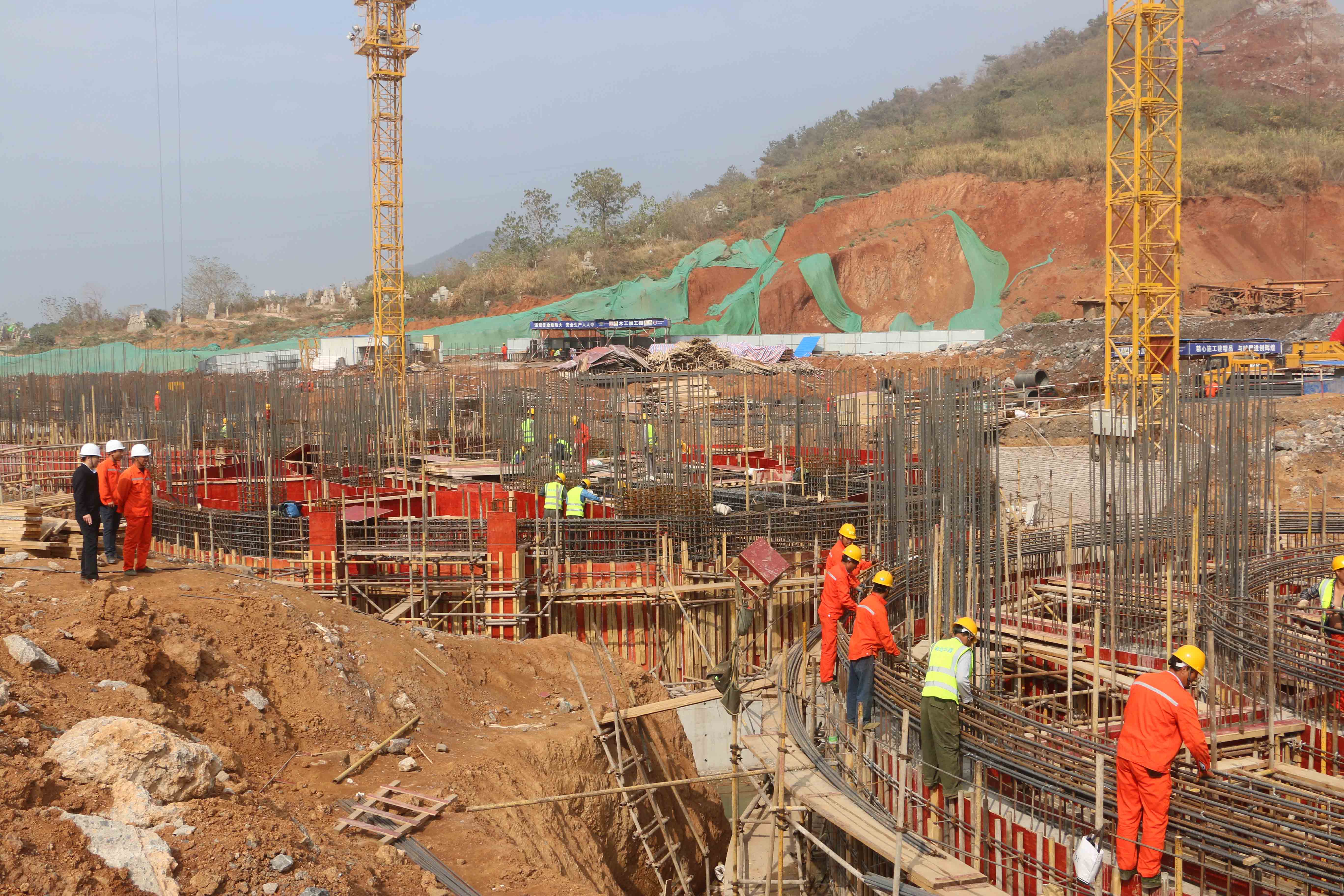 在经过1个小时的车程,我们来到了华新黄石年产285万吨熟料水泥生产线及环保协同处置项目。领导们与项目经理唐太山、劳务负责人陈树苗稍事寒暄后,立即戴上安全帽去施工现场查看工程进展状况。公司施工的余热发电工程位于整个项目的西南侧,目前汽轮机主厂房第一层(共三层)钢筋绑扎、模板支护完毕,即将浇注混凝土;循环水泵房基础钢筋基本绑扎完毕,即将支设模板;冷却塔正在打桩;其余几个小工号暂没有工作面。工地上材料堆放整齐、工人施工紧张有序,项目管理人员旁站到位,对工程质量、安全时刻监督。在查看完工地回到项目部后,领导们与项目部主要负责人员展开会谈。蒋总首先对项目整体进展情况进行了客观评价,并对劳务队伍劳动力不足的问题提出了批评和建议,华新万吨线项目目前业主碰到的最大问题就是进度问题,抢工期保证年底主线点火是整个项目的头等大事。我们进入项目后,华新领导对我们希望就是我们能够尽快形成施工小高潮,快速、质优、安全,给项目上其他施工单位做出表率,从而带动整个项目掀起施工高潮。劳务负责人陈经理立即做出表态,马上从其他地方向本项目调集人员,两天内增加18人,在人员全部到位后,将对汽轮机主厂房展开突击施工,争取达到10~12天一层的施工进度。蒋总告诫公司项目领导及劳务负责人,我们对外是一个整体,每个人都代表的是华盛公司的形象,只要我们在甲方做出过承诺,不管内部有多大困难,大家一定要齐心合力的想尽办法去完成,不允许因为一点利益问题而相互推诿。项目领导及劳务负责人对领导们作出了保证,华盛的品牌在他们手上绝对不会丢,只会越做越好,力争从业主那争取到更多的施工任务。